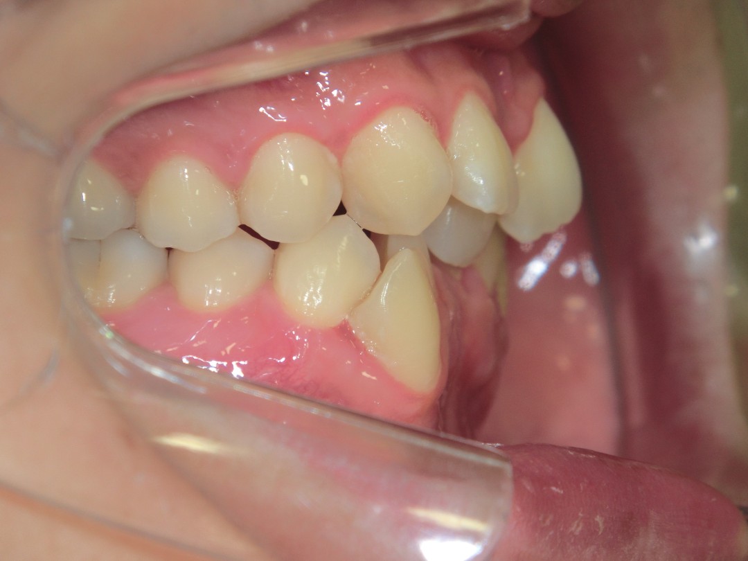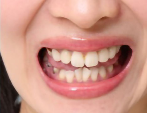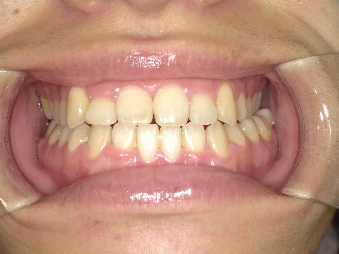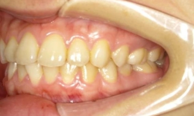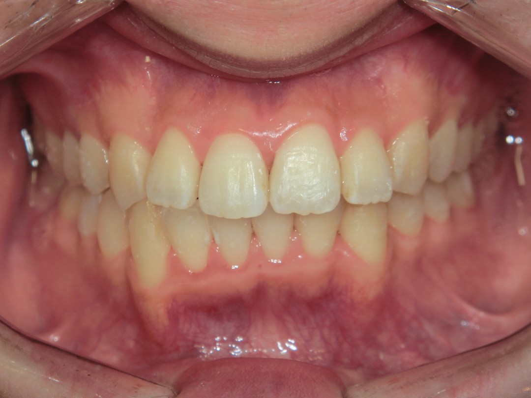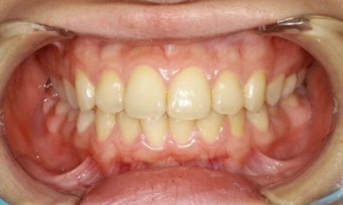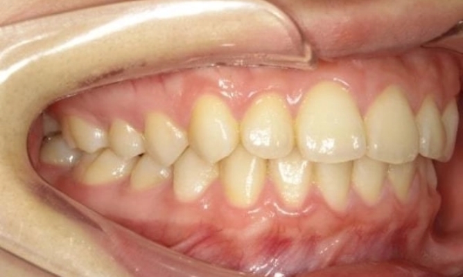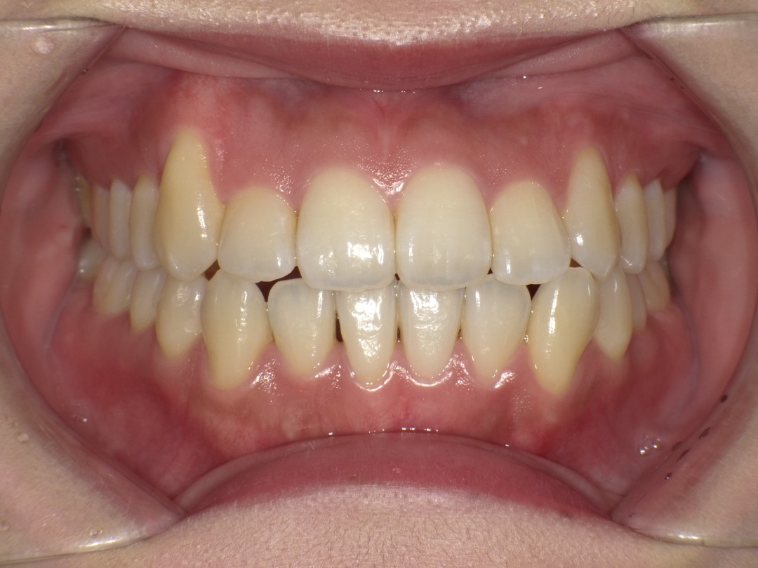 マウスピース型矯正装置を用いて、歯並びを整えた症例。治療のリスクとしては、痛み・治療後の後戻り・歯根吸収・歯髄壊死・歯肉退縮などが代表的。また、マウスピース矯正の装着時間が短いことにより、治療期間が長引くこともある。