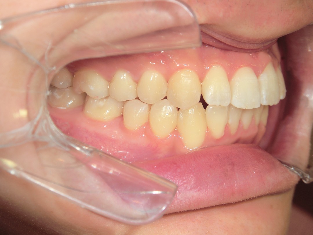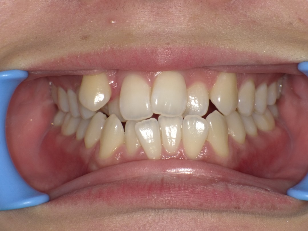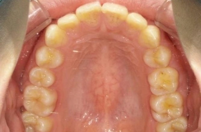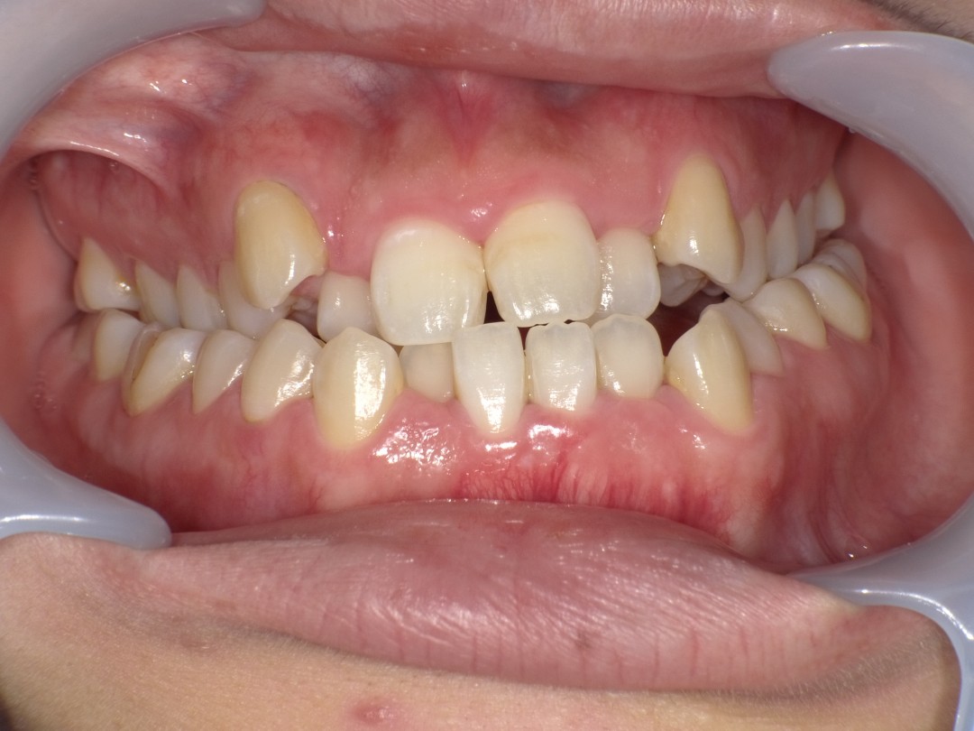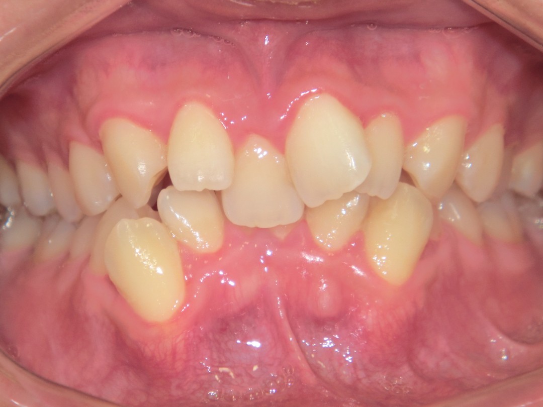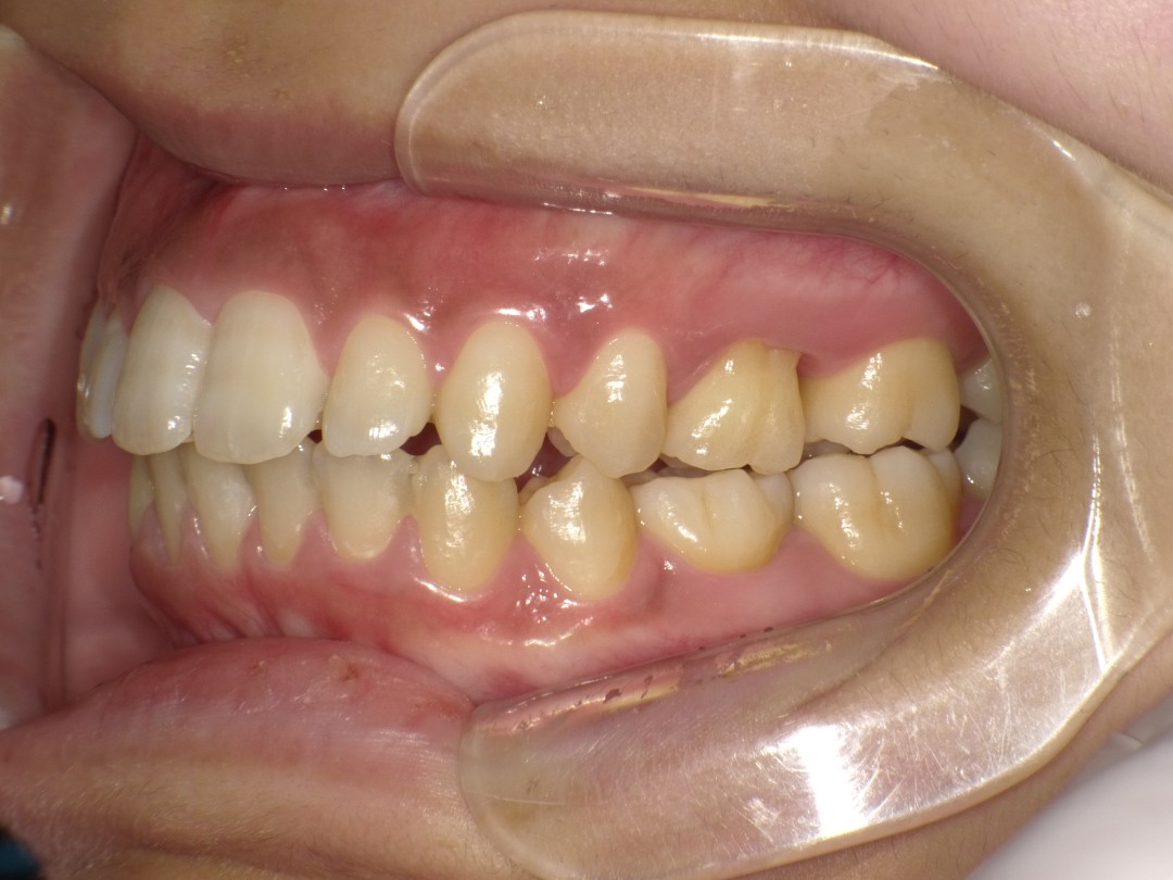 マウスピース型矯正装置を用いて、歯並びを整えた症例。治療のリスクとしては、痛み・治療後の後戻り・歯根吸収・歯髄壊死・歯肉退縮などが代表的。また、マウスピース矯正の装着時間が短いことにより、治療期間が長引くこともある。