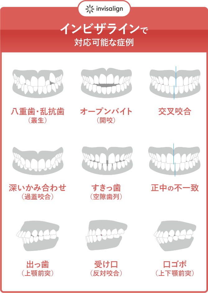 ワイヤーを使った通常の矯正治療の場合と同様の適用範囲と考えられています。ただし、担当医の治療方針、使用する装置の種類等によって対応できる範囲が異なります。詳しくは歯科医院へご相談ください。