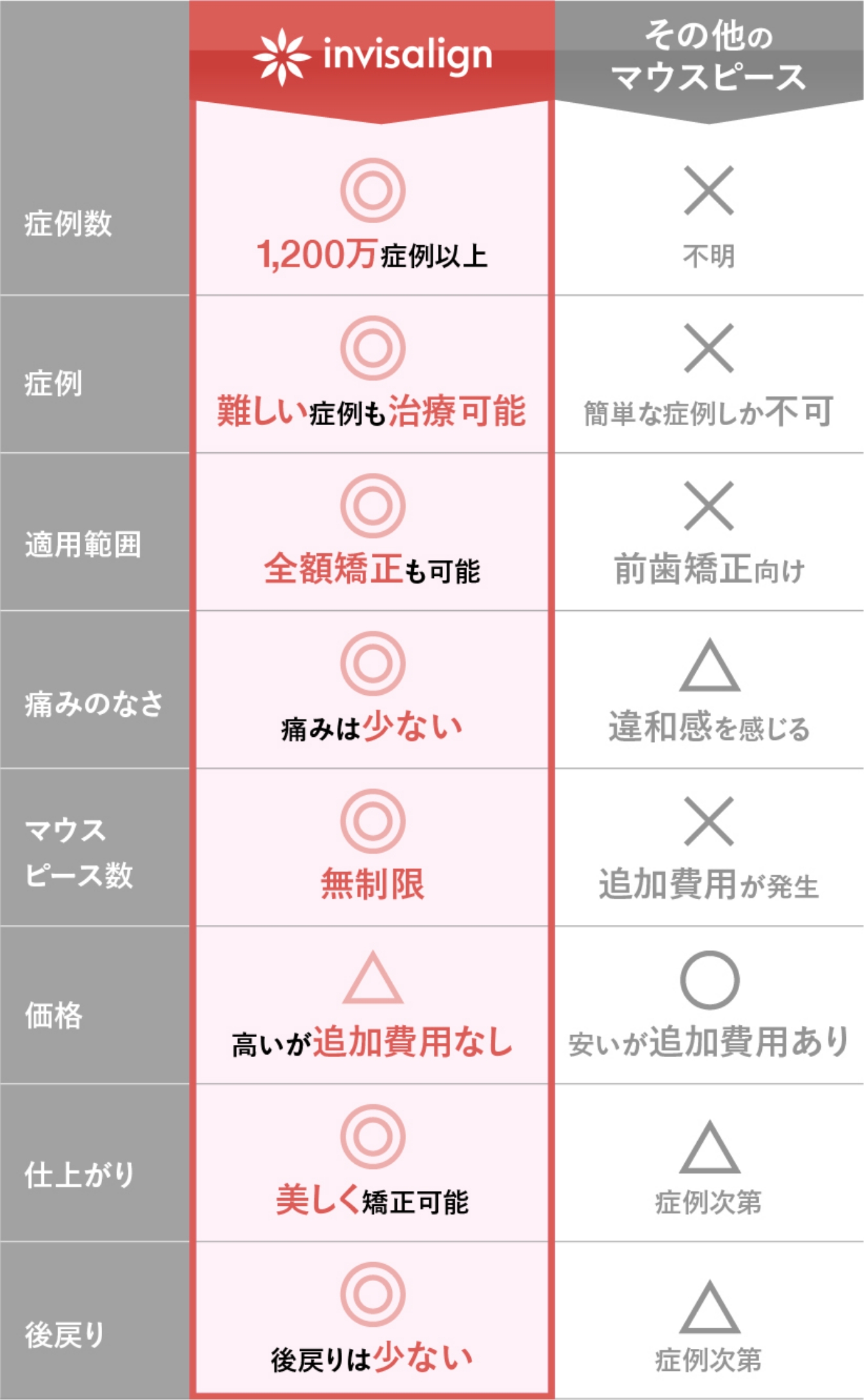 安価なマウスピースは前歯矯正がメインでそれには失敗も多いことや、他院のインビザラインも矯正医の技術によって難しい症例の対応可否が変わります。